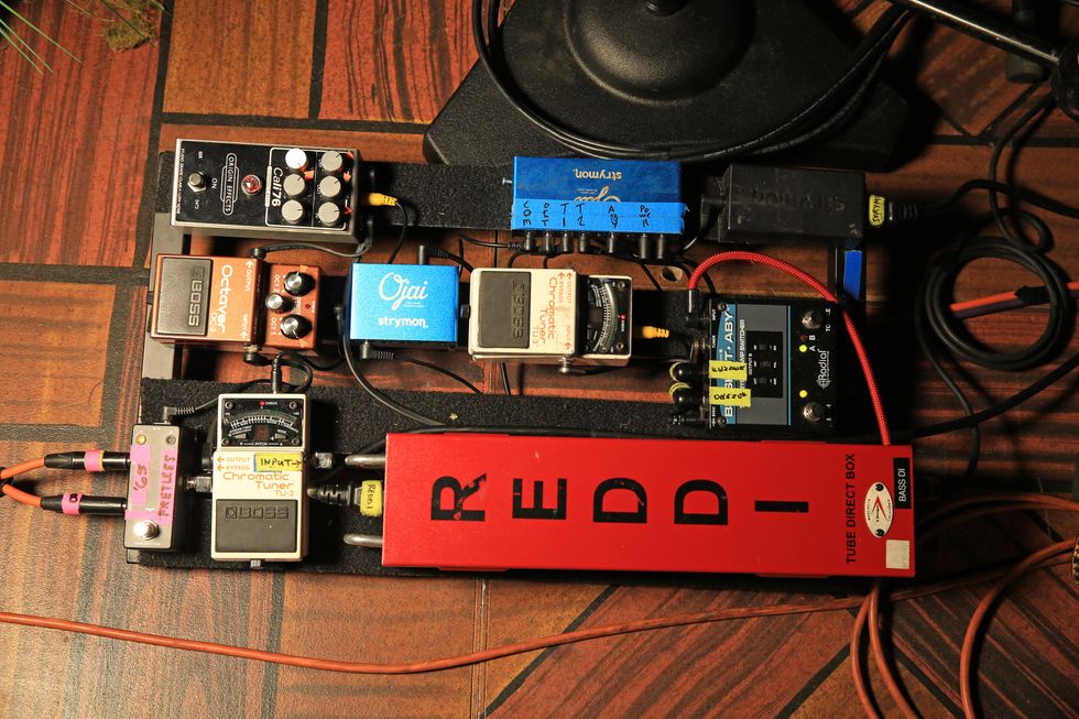 No pedals were on the floor for Burletic last time, but he’s since fleeced out a proper pedalboard for the arena tour (even if most of the boxes are utilitarian units). The actual tone twisters are a Boss OC-2 Octaver and an Origin Effects Cali76 Compact Bass Compressor. An A Designs REDDI DI box helps give FOH a crystal bass signal, while the Radial BigShot ABY wrangles the amps. Then he has a pair of Boss TU-3 Chromatic Tuners and double Strymon Ojai power supplies.