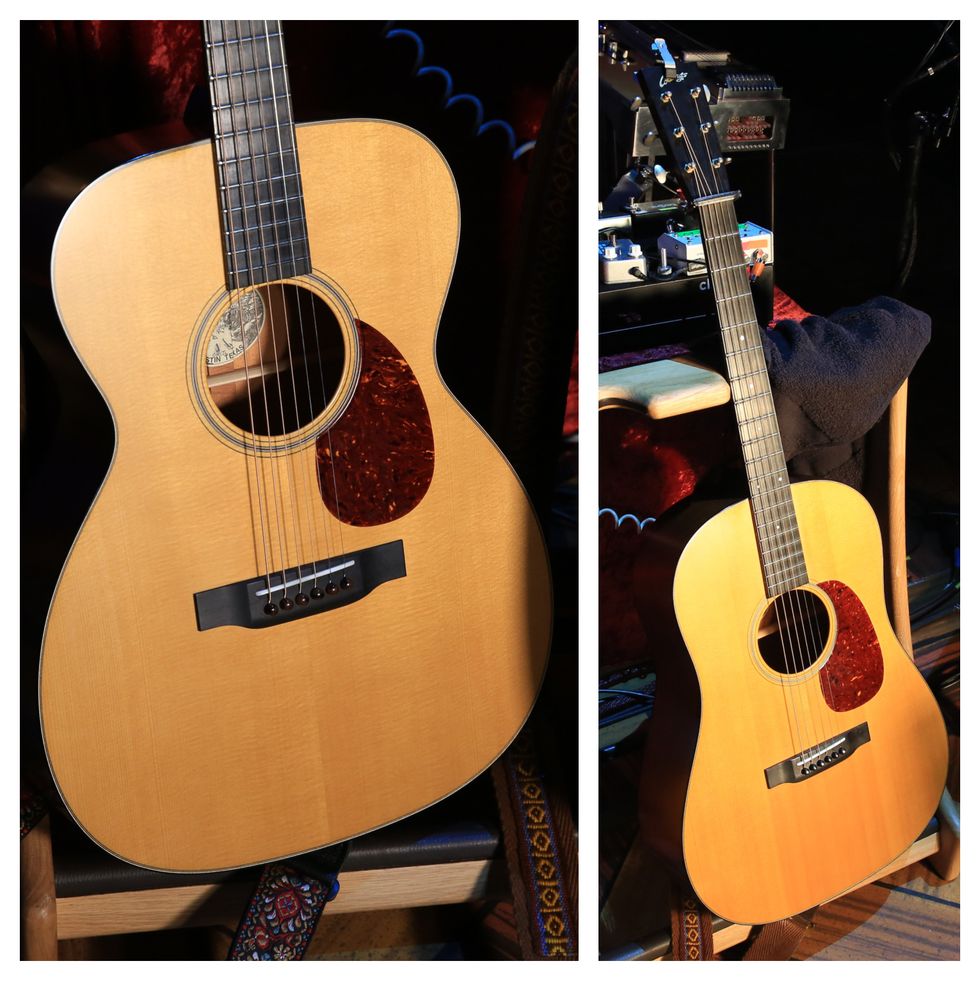 The 14-fret dreadnought on the right is a Collings D1A that has a Sitka spruce top, Honduran mahogany back, sides, and neck (modified V profile), an ebony fretboard, bone nut and saddle, nickel Waverly tuners, and pre-war scalloped X-brace pattern (with Sitka spruce).