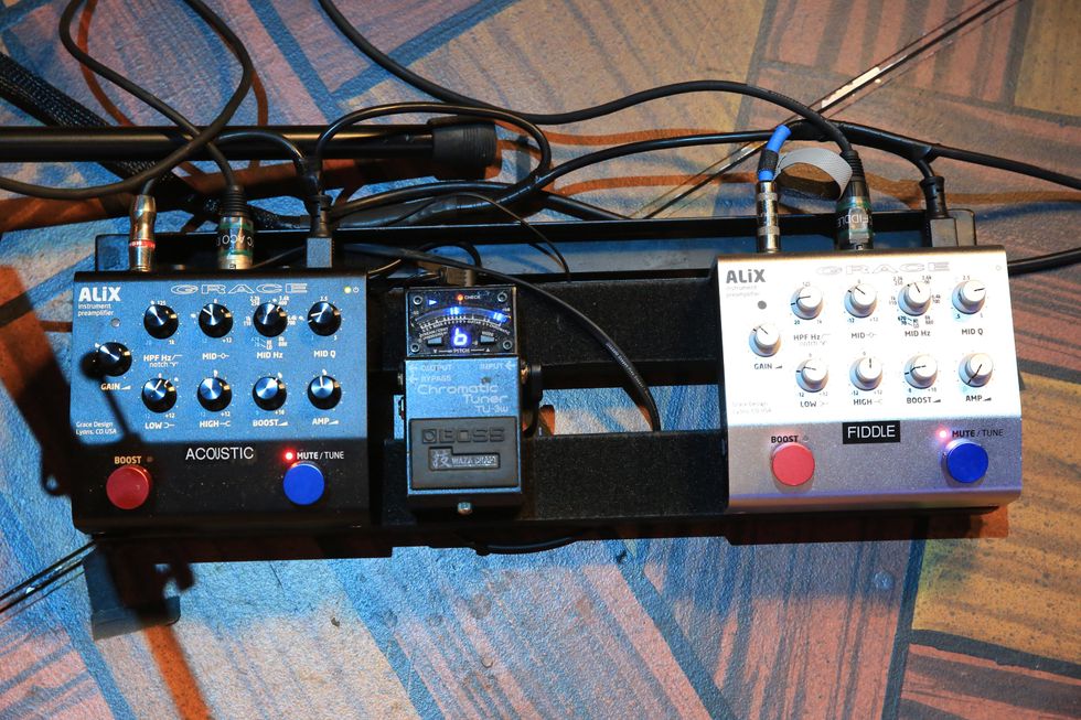 For a picker that mainly plays acoustics, his board is expectedly tame with a pair of Grace Design ALiX preamps (one for the Collings and another for fiddle) and a Boss TU-3w Waza Craft Tuner.