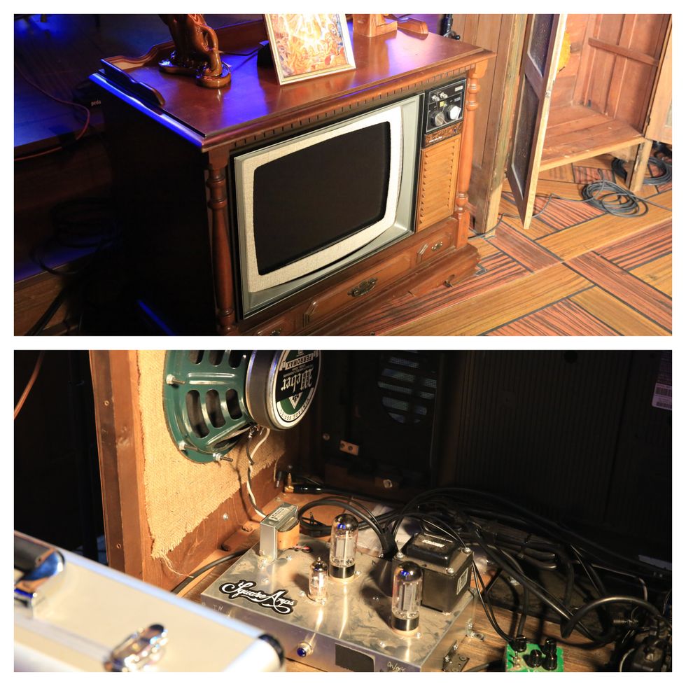 When Childers does grab an electric and throw down (usually during instrumental “Two Coats” from Can I Take My Hounds to Heaven?), he’ll get loud with this old TV that was actually his grandfather’s RCA set. On the backside rests a custom Square Amps head that Matt Richards built upon Tyler’s request. (Head here to read its quick backstory.) It has a single 12" Weber Vintage Series Ferromax speaker.
