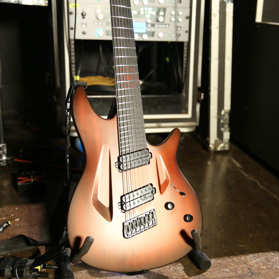 The silhouette of Zach Householder’s Arisitides 070 gives his main 7-string the turbo appeal of a Porsche 911. The futuristic guitar is made from the company’s proprietary Arium material and cast from a one-piece mold that is initially liquid, then hardens to give the instrument its final shape. Householder comments during the Rundown that the Arium-built 7-string is “designed to mimic the porousness of wood without the imperfections, so its resonance is just angelic. It’s the most gorgeous-sounding guitar.” It features a multi-scale setup (25.7"–27"), Hipshot hardware, and Lundgren Black Heaven humbuckers.
