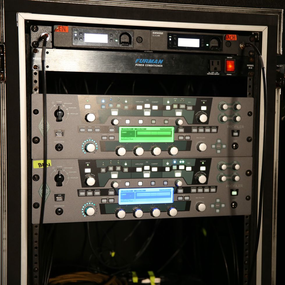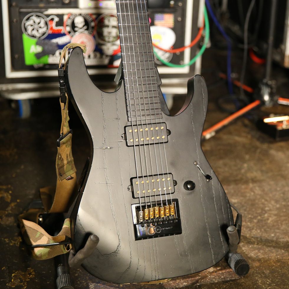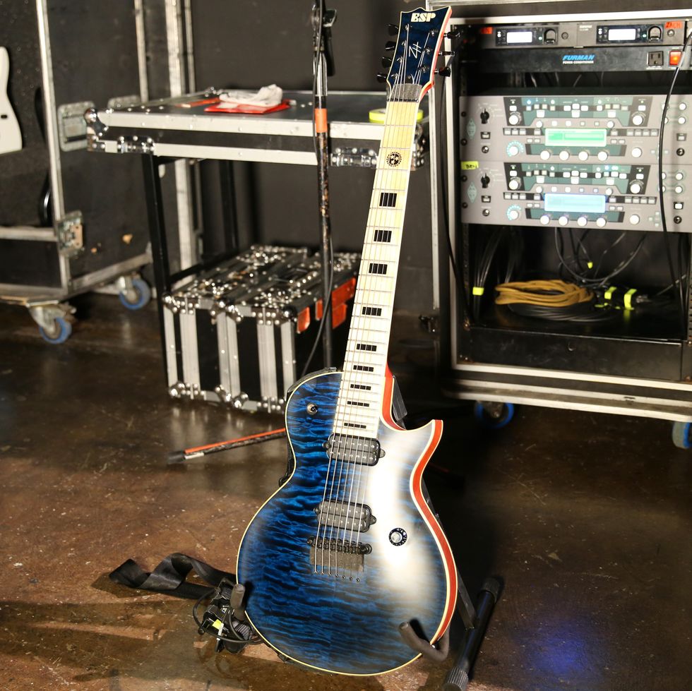 Zach’s signature ESP baritone 7-string has a 26.5" scale length on a set-neck construction that pairs a mahogany neck with a maple fretboard into a thick-bodied chunk of mahogany, capped by a quilted maple top. He originally had DiMarzio D-Activator 7 pickups in it, but found the set to be too dark and low-end rich to stand out among the band’s other two guitarists. He experimented with a batch of DiMarzio bridge humbuckers, but nothing was cutting it, so he tried putting a neck D-Activator 7 into the bridge slot. Presto change-o, the low-end fog was lifted: The neck model had decreased output, mids, and lows, but a higher top end compared to the bridge D-Activator 7. He then put the bridge humbucker into the neck slot, and it evened out the guitar.