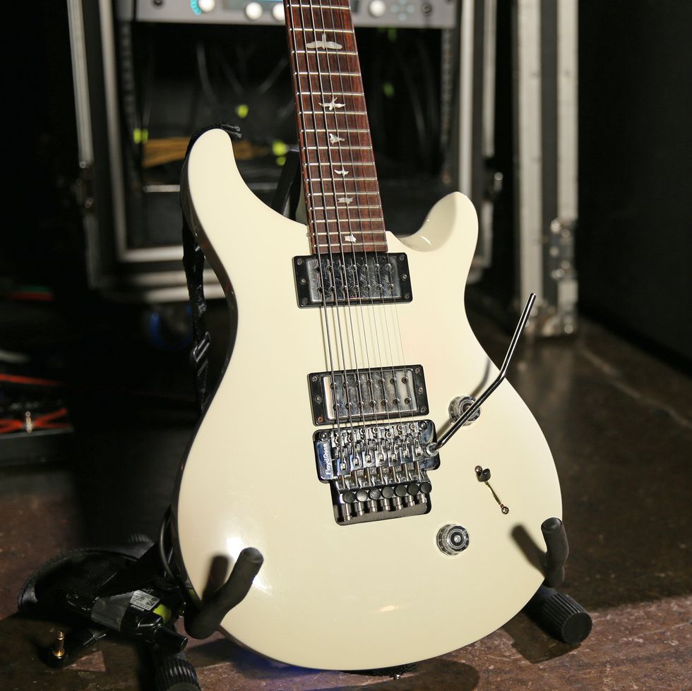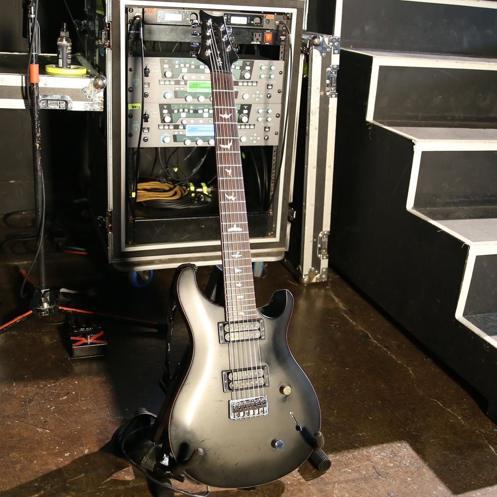 Before Mark Holcomb and his SVN signature took over the 7-string ranks for PRS, the Maryland outfit offered a standard SVN 7-string guitar. Ben Savage’s main squeeze for The Valley tour was this custom iteration. For the model, he requested an eye-catching white pearl finish, an official Floyd Rose bridge, and a set of DiMarzio D-Activator 7 humbuckers. While recording the band’s 2012 self-titled album, Savage A/B’d a bunch of humbuckers and found the D-Activator 7 pair to have the most brutal yet retained string-to-string, note-to-note definition. So, he’s stayed loyal to them for over a decade. He upgraded the bridge and locking-nut components with titanium pieces from FU-Tone. It does come with a coil tap for the bridge D-Activator that gets pulled out for the opening of “Black Bear.” Similar to Householder, he goes with D’Addario EXL157 Medium Baritone strings (.011–.068).