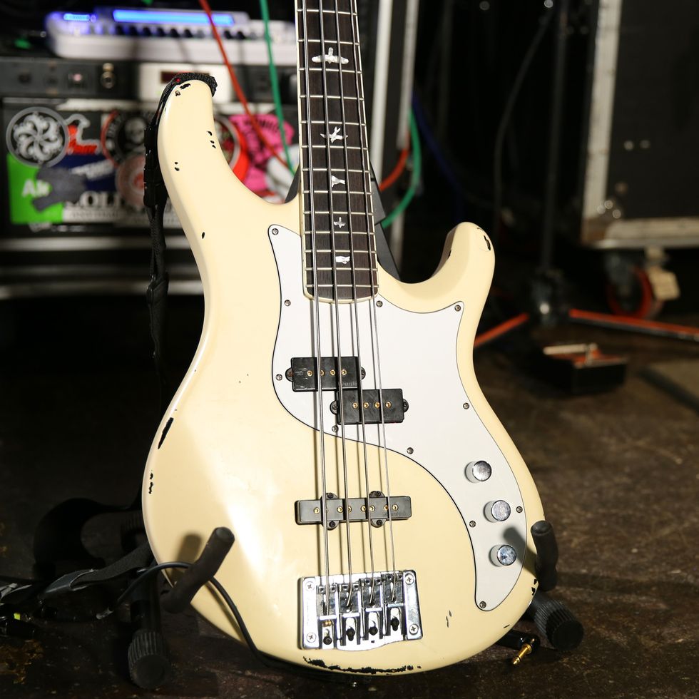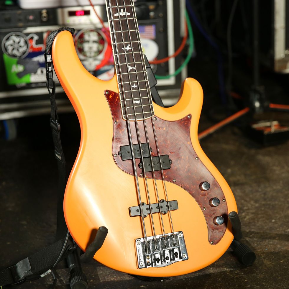 Whitechapel cofounder and bassist Gabe Crisp tours with a pair of PRS SE Kestrel 4-string basses that feature custom paint jobs and a set of DiMarzio Relentless PJ Pair. The Kestrel’s other essential ingredients are an alder body, 5-piece maple-walnut neck, rosewood fretboard, neck-through design, and Hipshot hardware (TransTone bridge and HB6 tuners). If you look closely, the beefy 4th string can’t fit through the TransTone bridge, denying it the definition of a true string-through setup. Crisp hammers the Kestrels with InTuneGP Grip .88 mm picks.