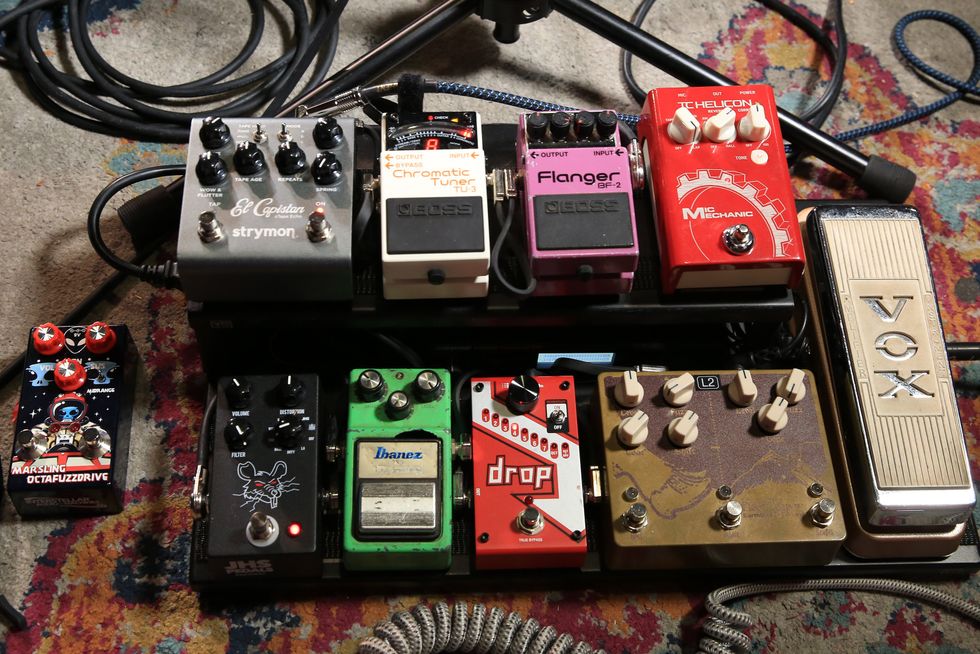 Person has done tours with just an overdrive pedal and nothing else, so by comparison, this two-tiered Vertex board is luxurious. Still, it’s compact and carries all he needs at the moment. The JHS Pack Rat is the core sound, set fairly heavy and dirty. The rest includes a Boss TU-3, EarthQuaker Devices Double Hoof, Vox Clyde McCoy wah, Boss BF-2, DigiTech Drop, Strymon El Capistan, and an Interstellar Audio Machines Marsling Octafuzzdrive. A TC Helicon Mic Mechanic rides along as a vocal effect so Person can keep control over his voice from night to night.