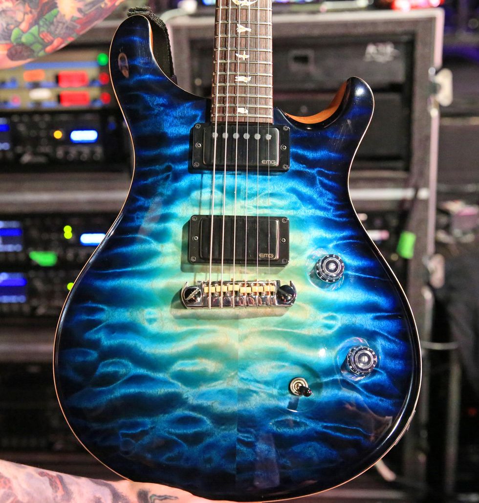 For this special set of shows, longtime rhythm guitarist Mike Martin brought out a pair of eye-popping PRS Custom 24s. First up is this remarkably, ruffled, quilted-maple top (on a mahogany body) that features a stunning “sub-zero-glow, smoked burst” created by Martin’s friend Brian Giampietro, who owns Brian’s Guitars in Cheshire, Connecticut. He dropped in an EMG 81 (bridge) and 66 (neck). The alnico V neck pickup is coil-tapped so Martin can clean up for the softer parts of All That Remains. Most of the band’s material is in either B standard or C# tunings. Martin uses Ernie Ball 2216 Skinny Top Beefy Bottom Slinkys (.010–.054) on both of his guitars and plays with custom Dunlop Tortex picks.