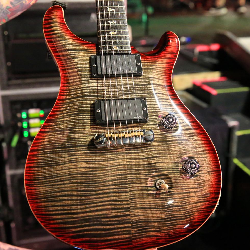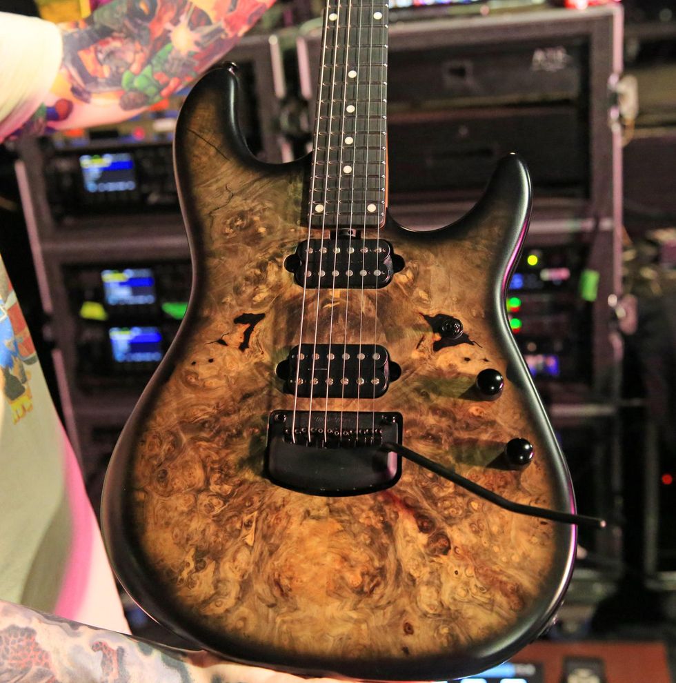 And the last signature axe that Richardson is carrying with him on this run is the Cutlass highlighting the exquisite nature of the buckeye burl top, with a complementary black burst that slightly rims the silhouette of the double cutaway.