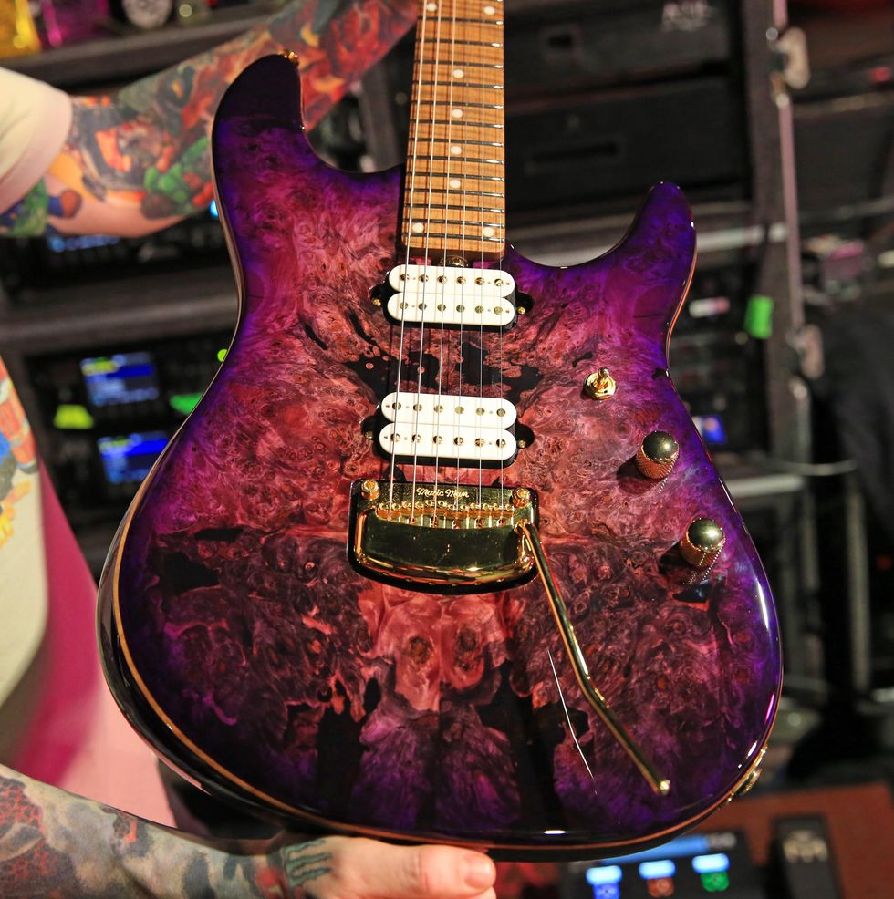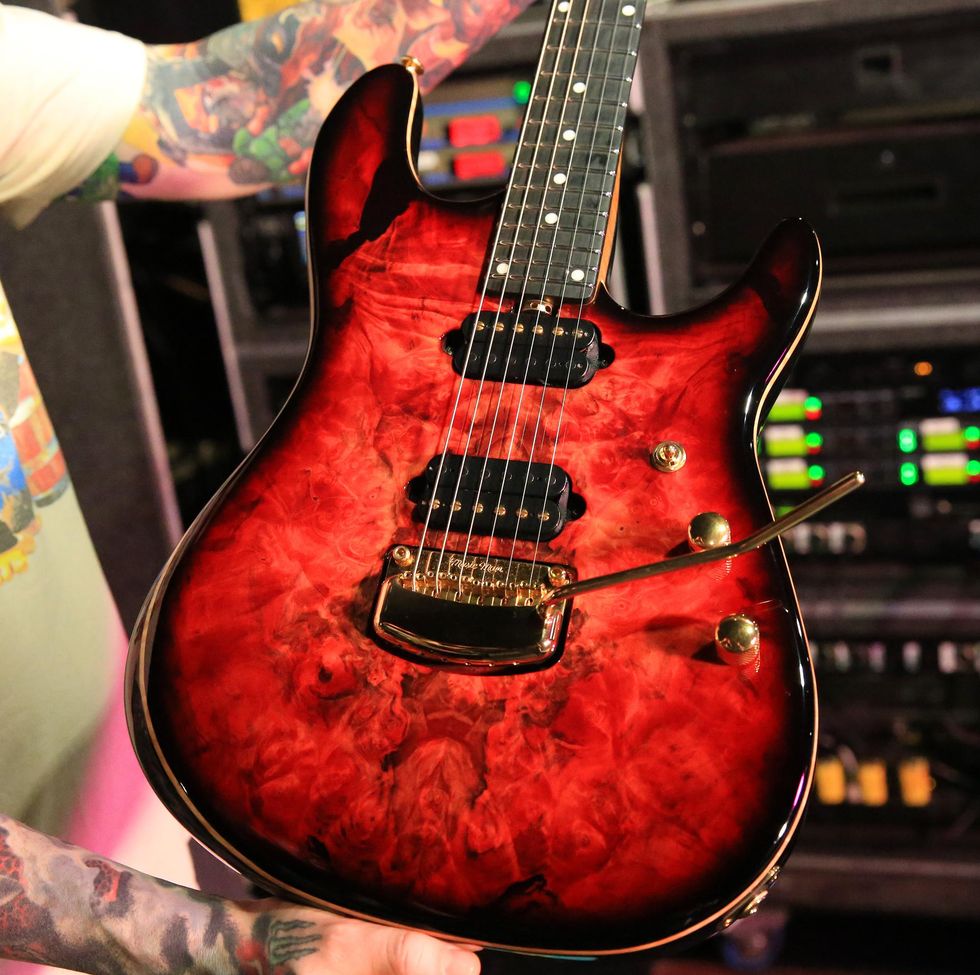 Here’s an Ernie Ball Music Man Jason Richardson Artist Series Cutlass finished in Rorschach red that debuted at the 2020 NAMM Show. The sandwiched wood between the alder body and buckeye burl top in this one is maple.