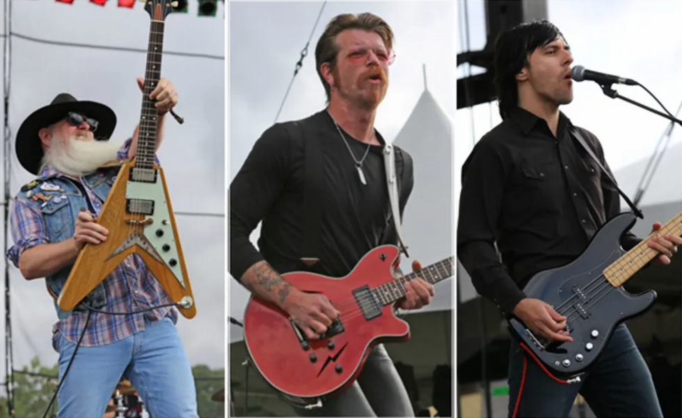 Eagles of Death Metal (left to right): lead guitarist Dave Catching, guitarist/frontman Jesse Hughes, and bassist Matt McJunkins.