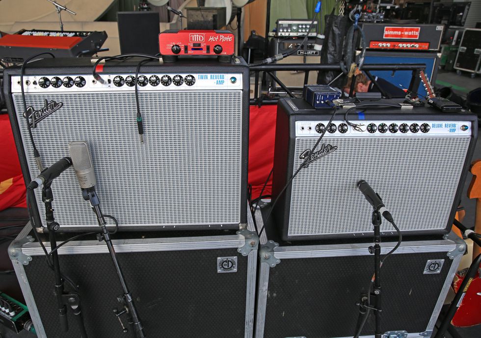 O’Connell’s core tone comes through the Fender ’68 Custom Twin Reverb. It’s always on, and he’s always plugged into the vintage channel with the bright switch engaged for primo piercing. He kicks on the ’68 Custom Deluxe Reverb for added oomph during louder bits.