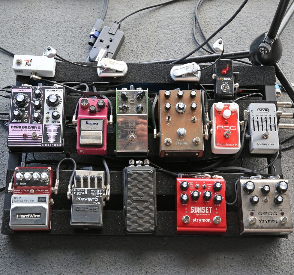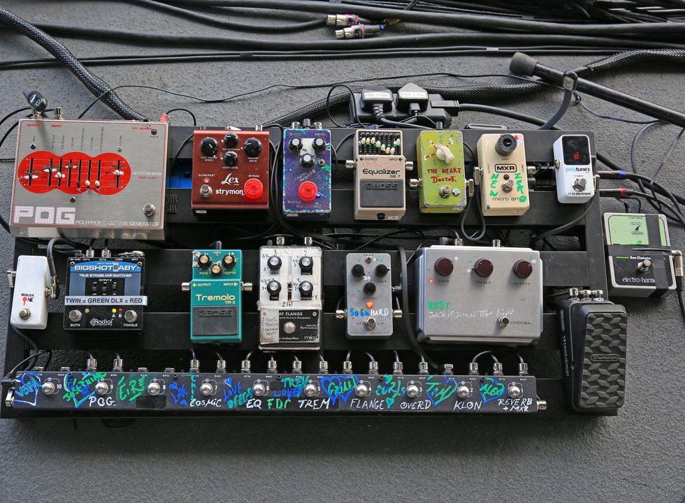 Dirty devils include a Ceriatone Centura, a Fairfield Circuitry The Barbershop Millennium Overdrive, and an MXR Micro Amp. Tone-twisting modulators include a Moog Minifooger MF Flange, a Boss TR-2 Tremolo, a Strymon Lex, a Moose Electronics Cosmo Tremorlo, and an Electro-Harmonix POG. A Boss GE-7 Equalizer helps shape his sound. Utility boxes in his setup are the Radial BigShot ABY True Bypass Switcher (toggling in and out the ’68 Custom Deluxe Reverb), a TC Electronic PolyTune 2 Mini, a Dunlop Volume (X) DVP4, and an Electro-Harmonix Hum Debugger. A TheGigRig QuarterMaster QMX handles all the switching.