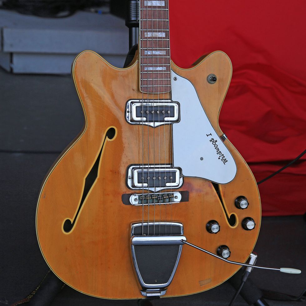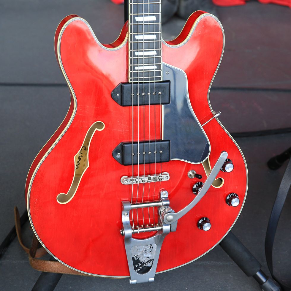 At one point, Curley was diving deep into Elliott Smith’s electric playing. Smith typically played a Gibson ES-330, but Curley didn’t want to dip into his Coronado money to get an ES, so he opted for this similar Eastman T64/v that shares a lot of the 330’s ingredients, including a 16" thinline hollowbody construction with laminated maple, 24.75" scale length, and dog-ear P-90s (Lollar).