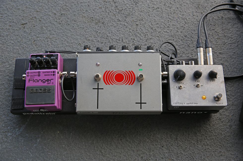 Curley has a robust appetite for pedals. This small platter is his rotating appetizer board that is currently testing out a Boss BF-3 Flanger, an EarthQuaker Devices Sunn O))) Life Pedal, and a Fairfield Circuitry Hors d’Oeuvre? active feedback loop.