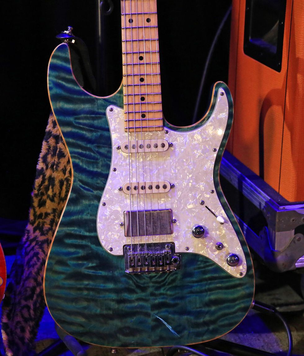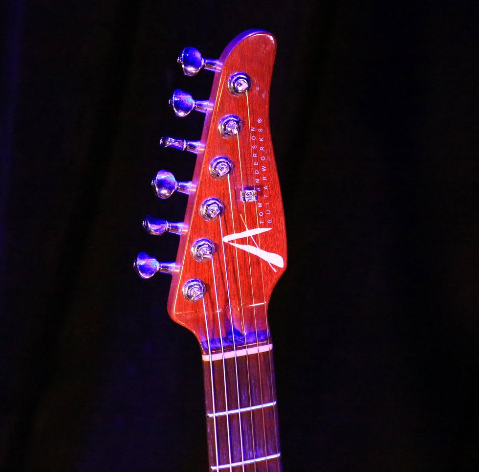 This is Wicklund’s main silence-killer: a Tom Anderson Drop Top Classic model with a wickedly striped finish. There’s a 5 db boost switch between the tone and volume controls, and the maple neck, with 22 jumbo frets, is slim and speedy. The instrument has a tremolo bridge, but Wicklund sometimes leaves the bar in the case.