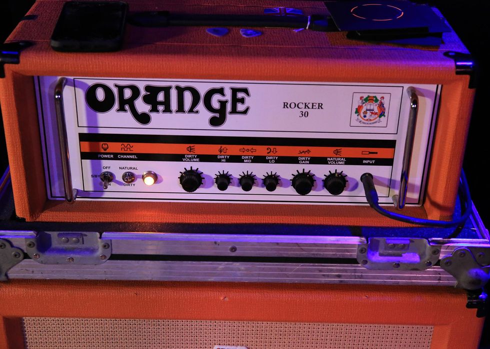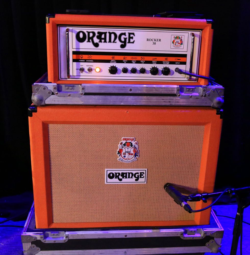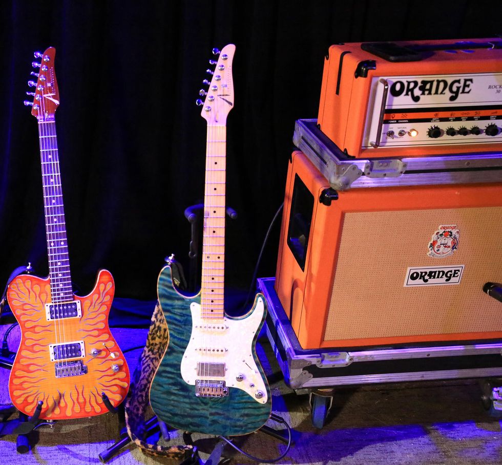 Here’s a look at the nucleus of Wicklund’s burly tones: her Tom Anderson Cobra T and Drop Top Classic, alongside her Orange Rocker 30 and 2x10 head.