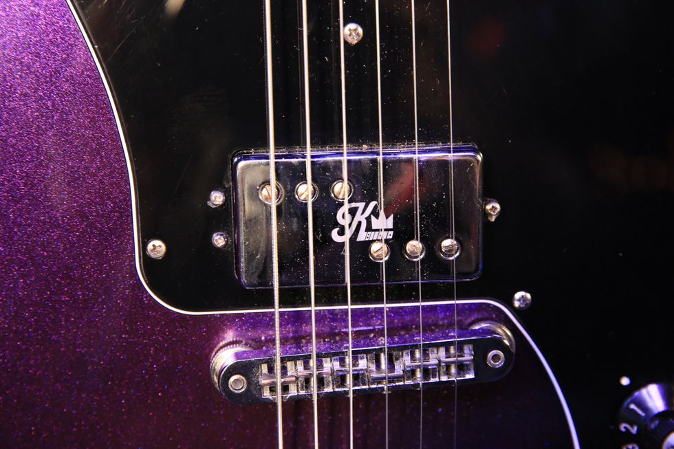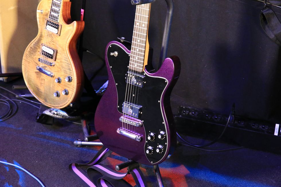 Christone Ingram’s signature Fender Kingfish Telecaster Deluxe comes in a finish called Mississippi night, the color, he explains, of the Delta evening sky. It’s got a roasted maple neck with a rosewood fretboard, two hot Custom Kingfish humbuckers in its alder body, a V-profile neck, a Tune-o-matic bridge, medium jumbo frets, and a 12” radius. There’s also a couple cool little filigrees (next), and he uses Ernie Ball Power Slinky .011 sets.