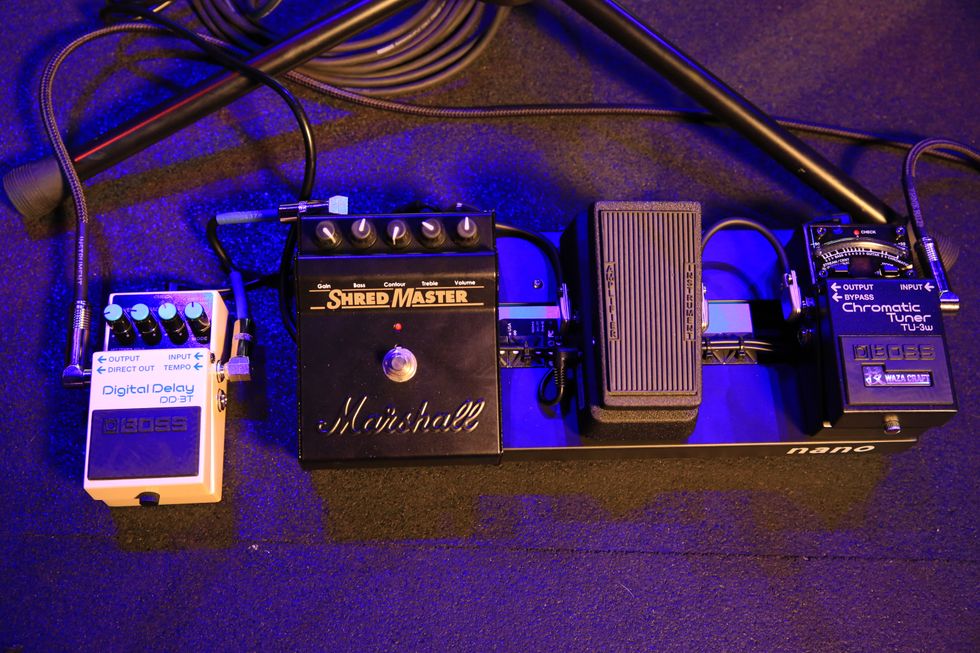 The signal starts with a Shure Wireless BLX4, which hits a Boss TU3w Tuner. From there, the route is a Dunlop Cry Baby Mini Wah, a Marshall Shredmaster, and a Boss DD3 Delay, all powered by Strymon. The pedals live on a Pedaltrain Nano board and were assembled by Barry O’Neal at XAct Tone Solutions.