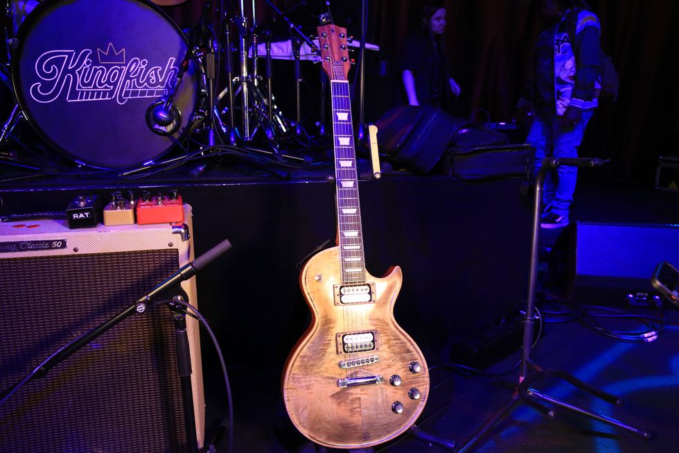 Ingram brought his old main axe on this tour. The LP-style was custom-built by Michael Chertoff and given to Kingfish when he was just 16 years old. He literally played the frets off of it. Now on a second set of frets, this guitar features a set neck, maple cap with a mahogany body, and Jalen humbuckers. It also wears Ernie Ball Power Slinky .011 sets. And his picks are Dunlop Jazz IIIs.
