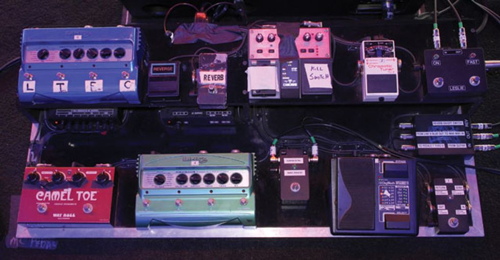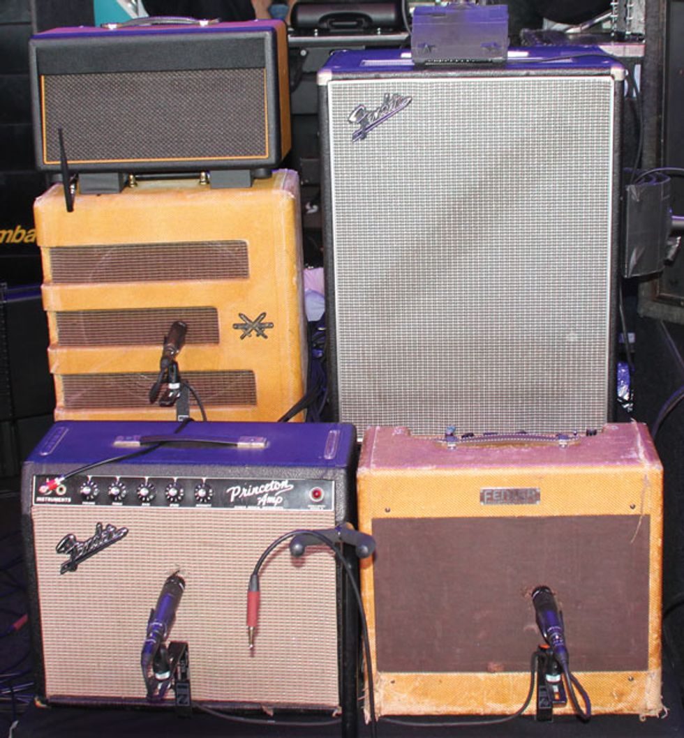 The basic formula for Campbell's amp rig is to crank up some low-watt amps and let the PA do all the heavy lifting. The bulk of his sound comes from a 1963 Fender Princeton and a 1954 Fender tweed Deluxe. He augments that with a custom Fender Excelsior and a Fender Vibrotane for Leslie-type effects.
