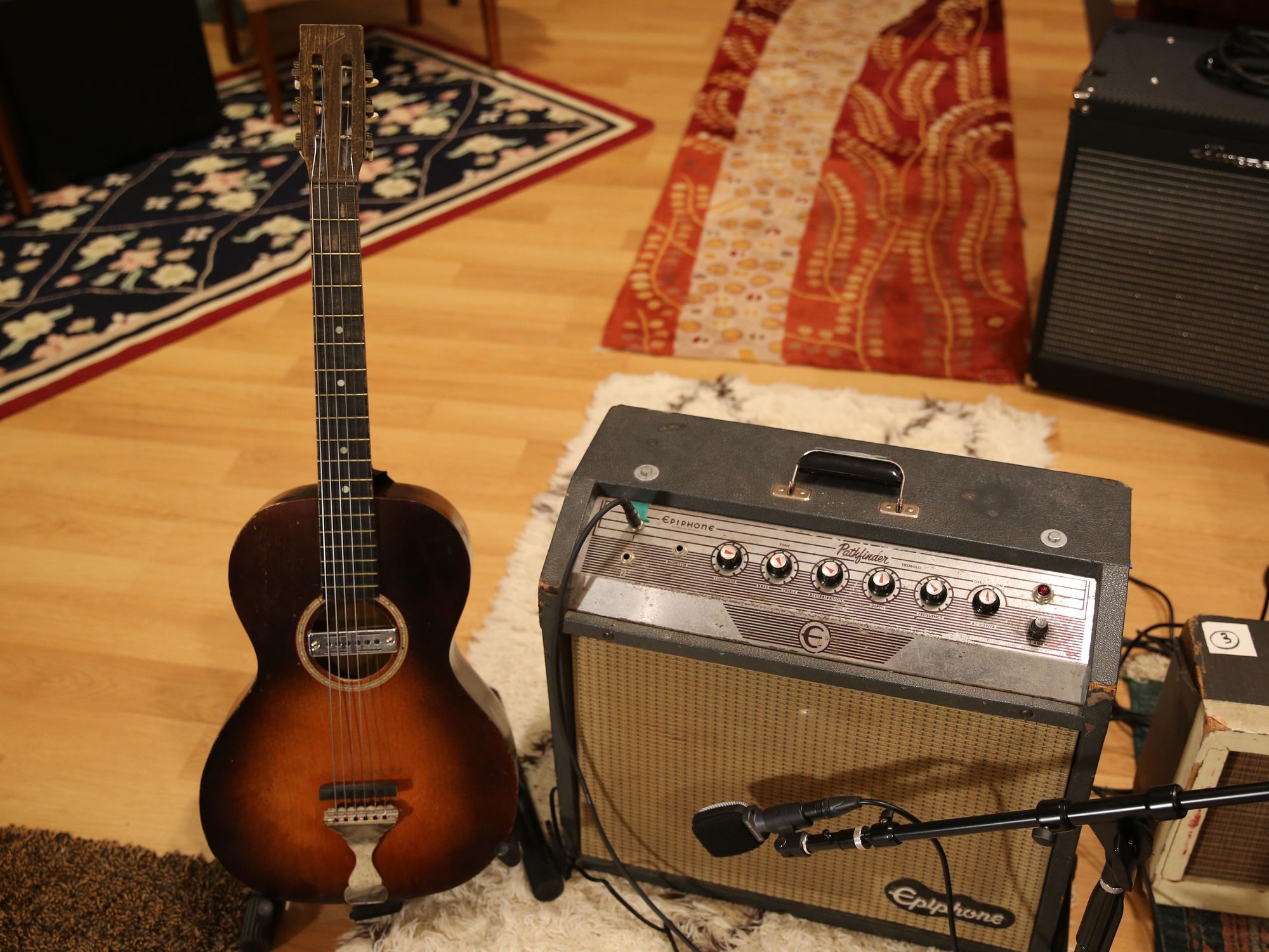 Talk about a peculiar pairing—here's a 1930s Stella he got for $200 in Augusta, Georgia, while the amp is a 1960s Epiphone Pathfinder.
