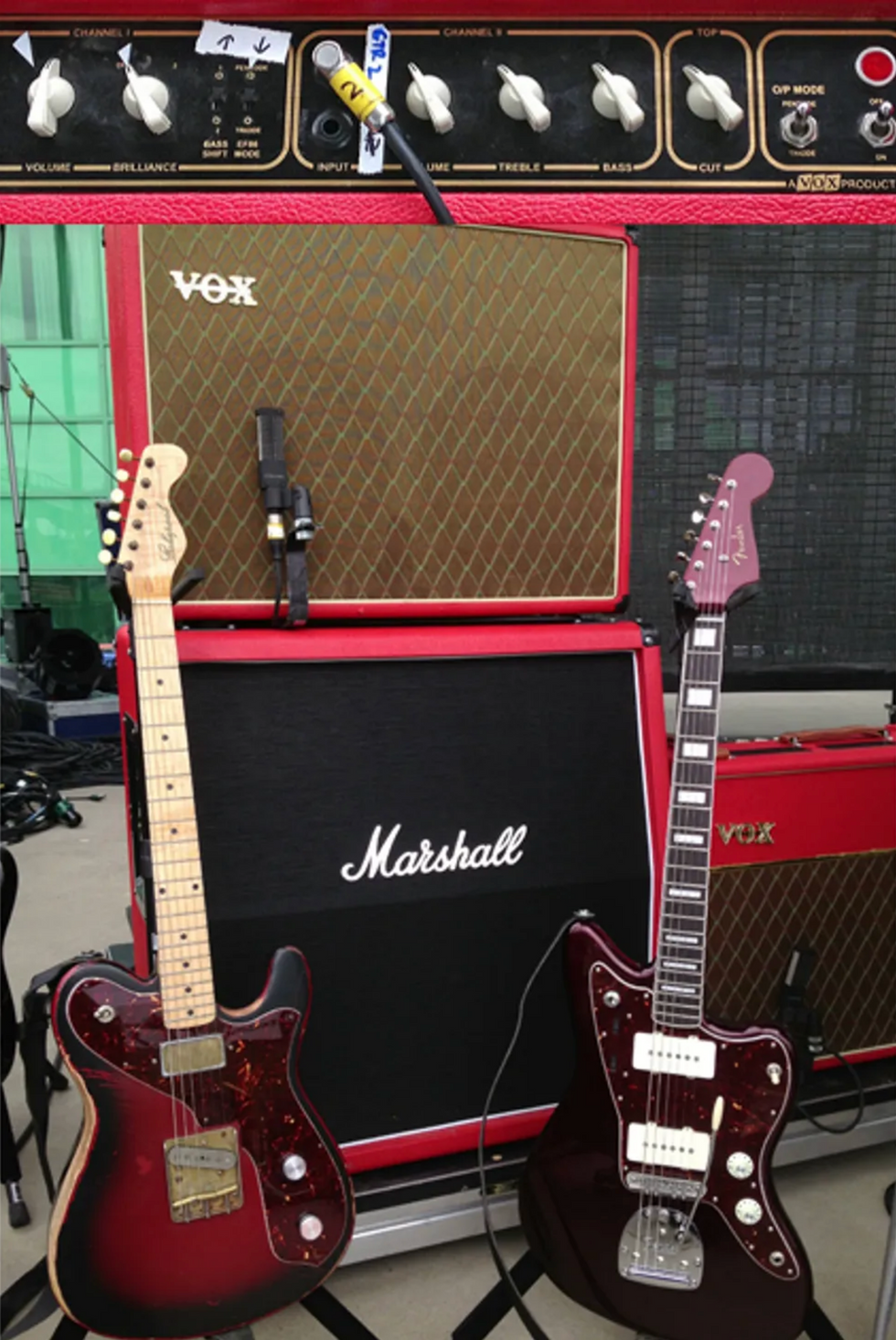 The former Perfect Circle guitarist's QOTSA rig consists of three main guitars—an Echopark T-style, his signature Fender Jazzmaster with a Mastery bridge, and a Burns 12-string (not shown). He plays through two Vox AC30s, a combo and a head driving Vox and Marshall cabs.