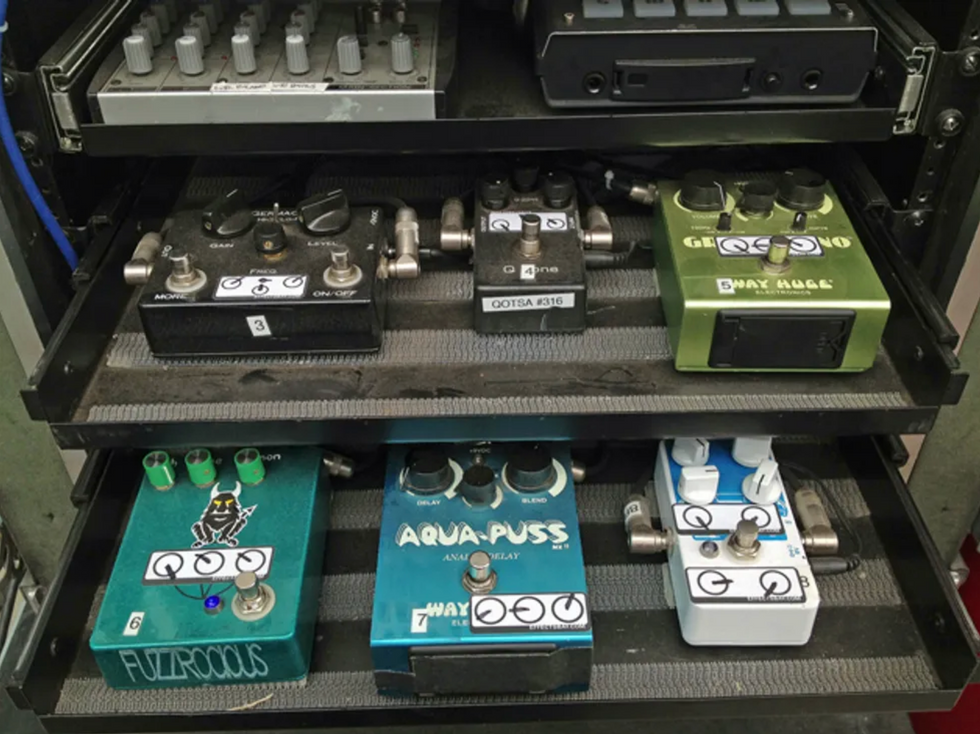 He also has a rack with two drawers holding Way Huge Green Rhino and Aqua-Puss pedals, an EarthQuaker Devices Dispatch Master, a Fuzzrocious Demon, and an MXR Q Zone, among other stomps.