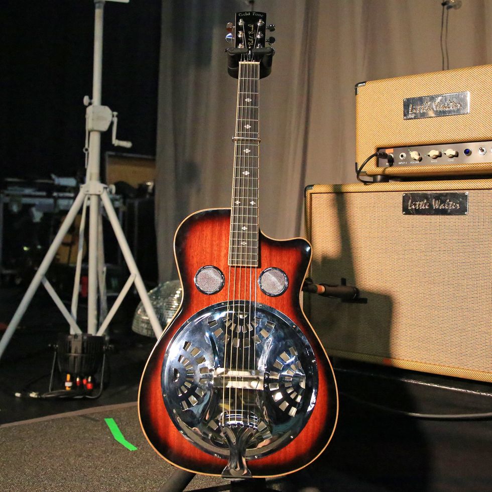 Duncan’s Gold Tone Paul Beard Signature Series Resonator wears Ernie Ball bronze-alloy Earthwood light acoustic strings.