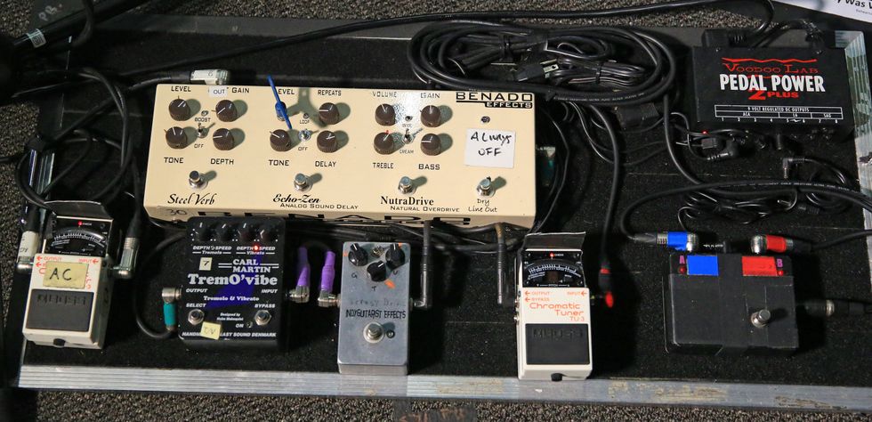 This comparatively stripped board does the job for Duncan. It’s got two Boss TU-3 tuners, an IndyGuitarist Effects custom OD, a Carl Martin TremO’vibe, and a Benado multi-effects with a Steel-Verb, Echo-Zen delay, and NutraDrive OD.
