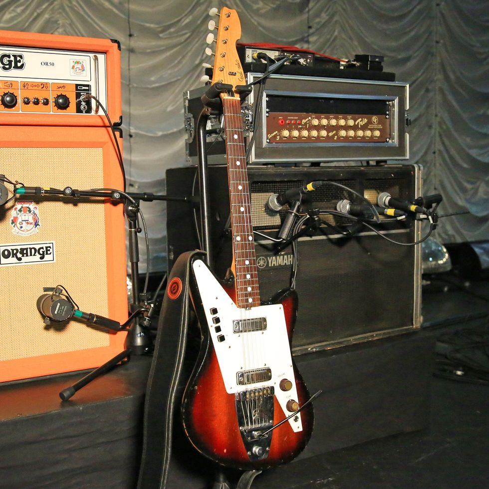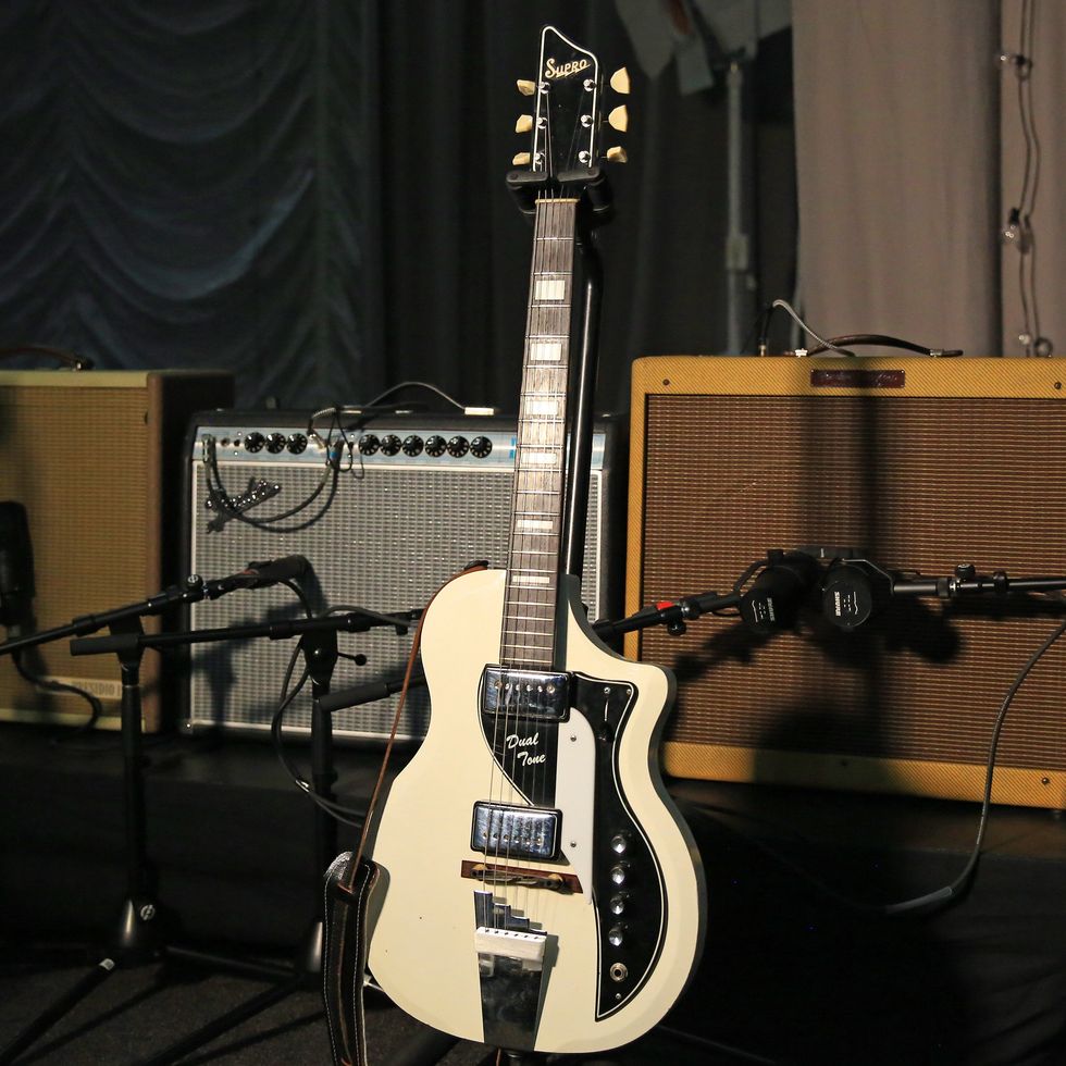 Victor Krauss has a distinctive sonic setup, since he covers both bass and guitar in the band. One of his main instruments is this 1967 Galanti Grand Prix.