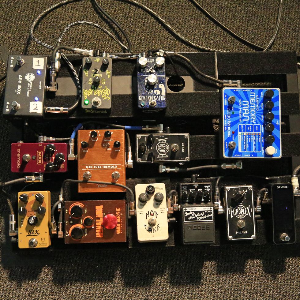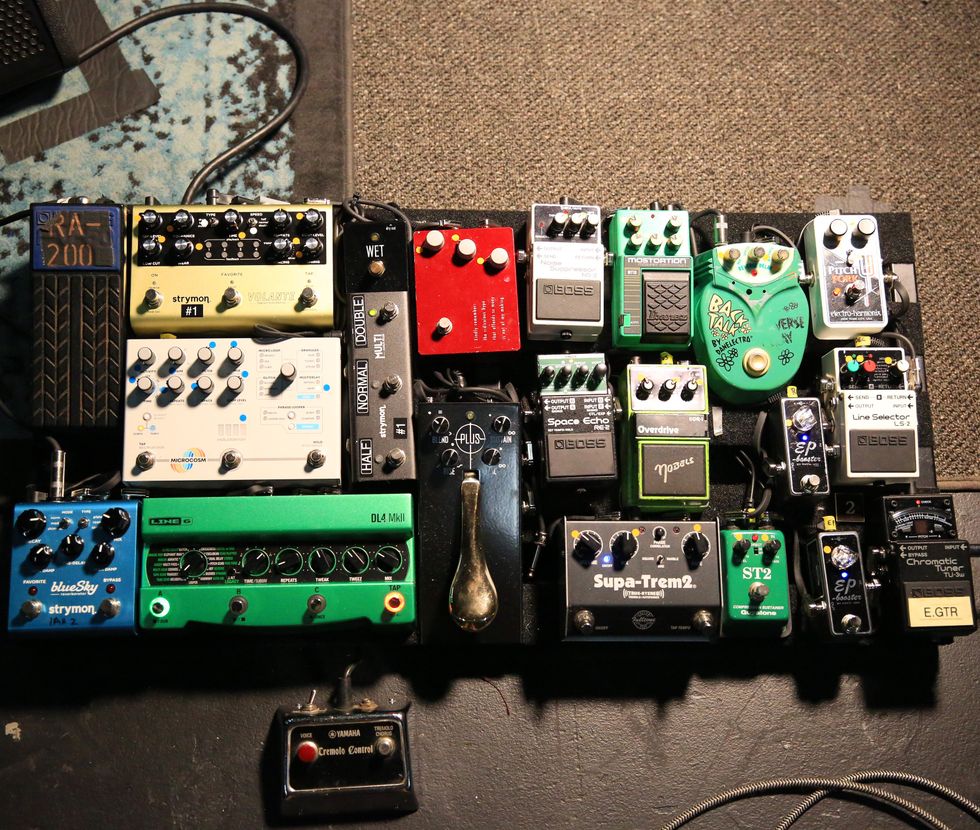 From his hands and instruments’ strings, the signal goes to a Boss TU-3W tuner, an Xotic EP Booster, a Guyatone ST2 compressor, another EP Booster, a Boss LS-2 Line Selector (with a send/return to an EHX Pitch Fork and a Danelectro Back Talk), a Nobles ODR-1, a Mostortion MT10, a Boss NS-2 Noise Suppressor, a Klon KTR, a Game Changer Audio Plus Sustain (controlling a Boss RE-2 Space Echo), a Fulltone Supa-Trem2, a Strymon Volante, a Hologram Microcosm Granular Looper & Glitch pedal, a Line 6 DL4 MkII delay, a Strymon blueSky, and an Ernie Ball volume pedal for the Yamaha RA-200R, another Strymon blueSky, and a Demeter VTDB-2B Tube DI for the Danelectro.