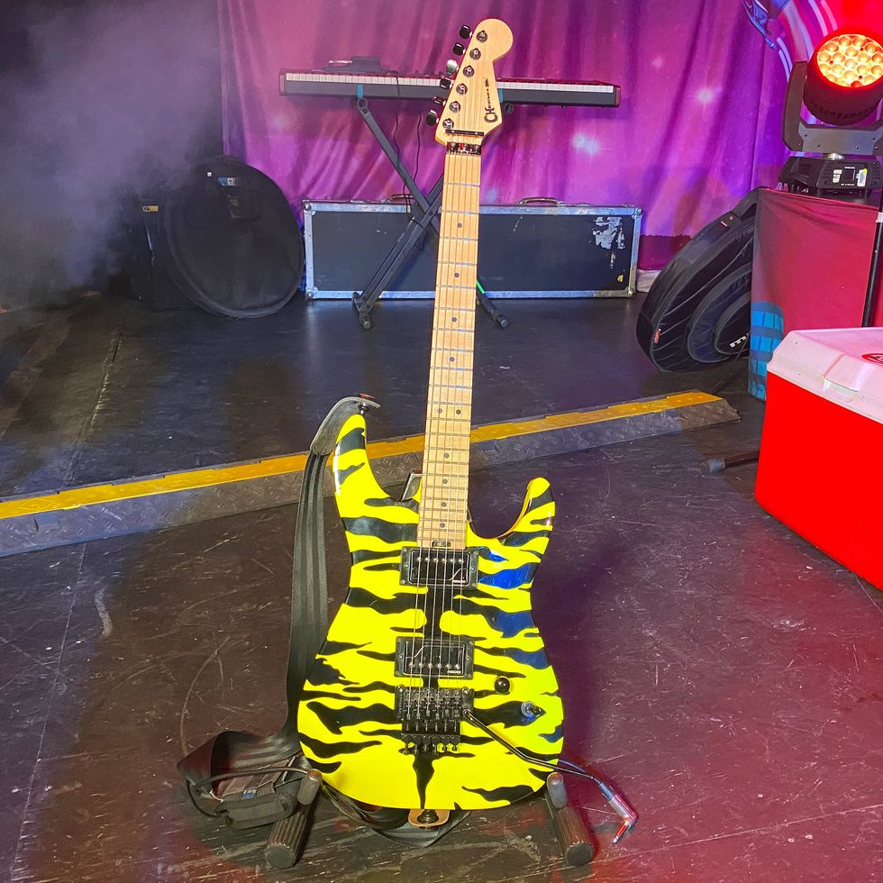 Satchel’s main axe is his Charvel Satchel signature model in yellow bengal, which features a 25.5"-scale maple fretboard with a neck with a compound radius of 12"-16". This tiger also features two Fishman Fluence humbucker pickups and a Floyd Rose tremolo.