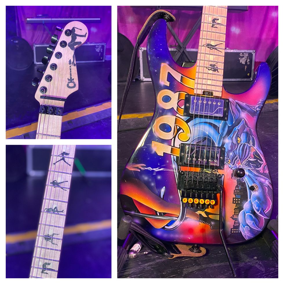 This custom 1987 Charvel Satchel model, made to commemorate Steel Panther's latest album, has all of the ingredients of the standard Satchel model, but features art by Ron Williams from RonzWorld Guitars. The design includes a graffiti-inspired top and back and strippers pole-dancing on the fretboard.