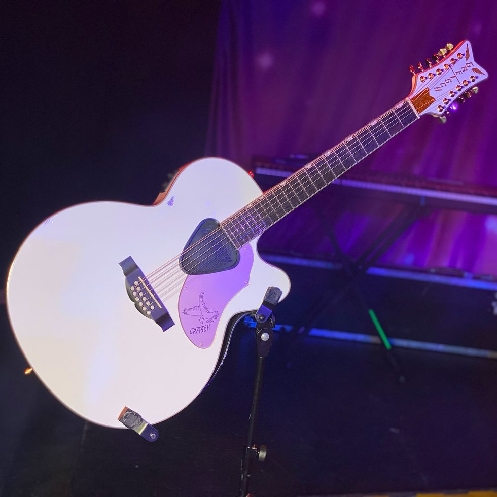 When Satchel wants to go acoustic, he steps up to his Gretsch G5022CWFE-12 Rancher Falcon Jumbo 12-String Acoustic-Electric guitar, which remains on a K&M acoustic guitar performer stand so he can easily switch back to his Charvel when he wants to unleash hell.