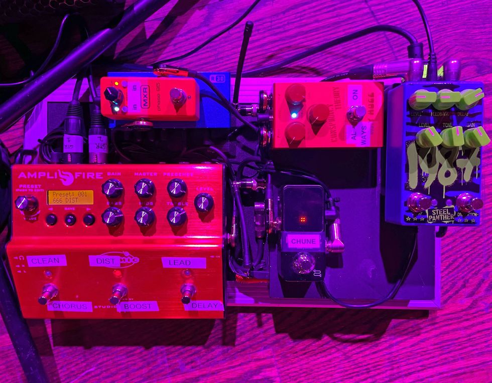 Satchel runs his Charvel into a Sennheiser EW 572 G3 Wireless which sends his face-melting riffs into his TC Electronic Polytune 3 Noir Mini, followed by an All Pedals Steel Panther 1987 Distortion & Delay, a Way Huge Smalls Conspiracy Theory Professional Overdrive, and an MXR Phase 95. A Strymon Ojai provides the juice.