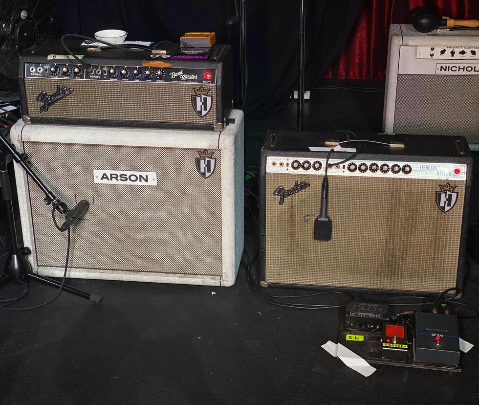 Keeping it all Fender, all the time, Arson plugs into both cherished time periods of Fullerton amp lore. Side A is a black-panel Bandmaster that hits a vintage Hiwatt cab outfitted with Celestion Heritage Greenback speakers. Side B is a silver-panel 1976 Fender Vibrolux. Notice Arson is plugging into the vibrato channels of both amps and each has its bright switch engaged.