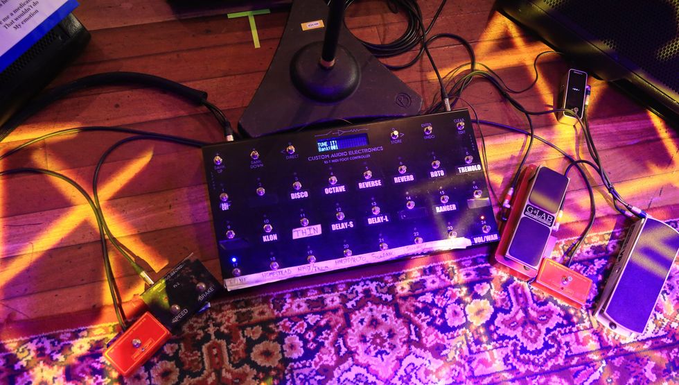 Haynes uses a Custom Audio Electronics MIDI foot controller to access most of his pedals, which live in an offstage rack. His Ernie Ball JP Jr. volume pedal, signature G-Lab WOWEE Wah WH-1, and a D’Addario tuner sit alongside.