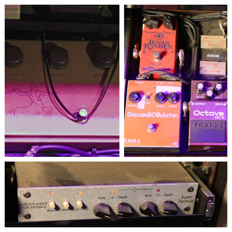 On one shelf of Haynes’ rack sits a gold Klon Centaur, Diaz Texas Ranger treble booster, Boss OC-2 Octave, Emma DiscumBOBulator envelope filter, and a CAE Super Tremolo.