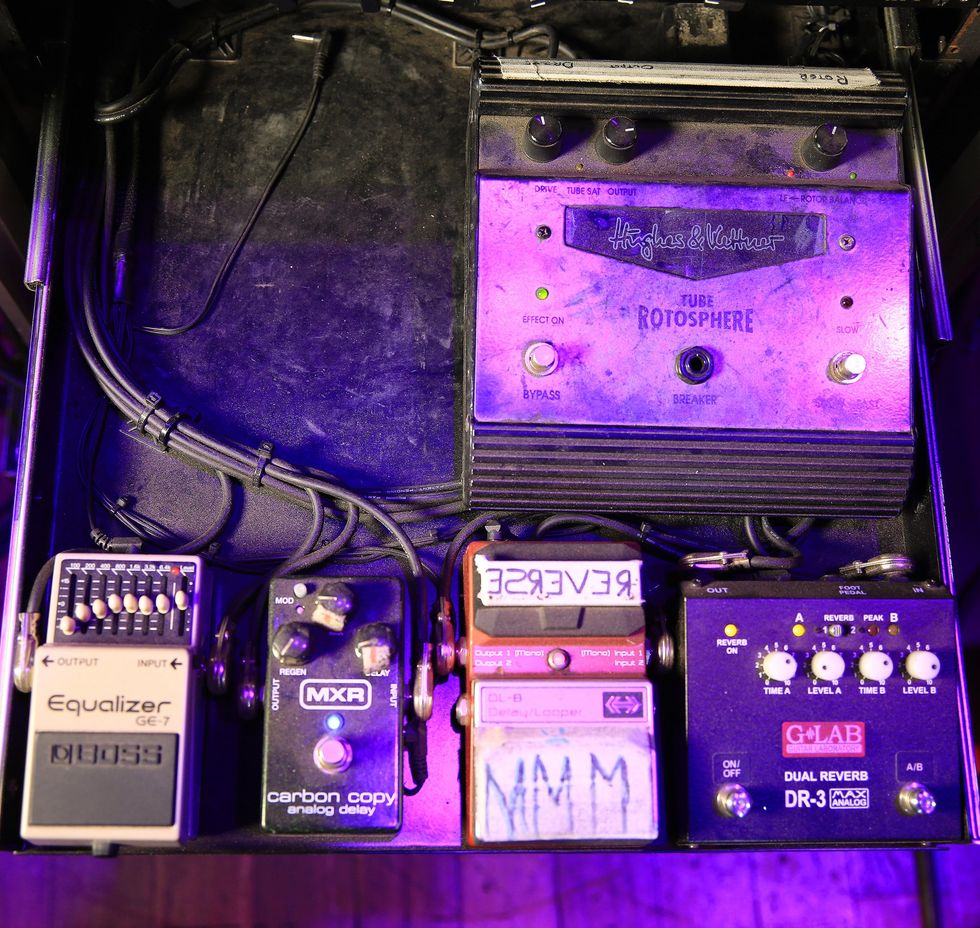 And on the other is a Hughes & Kettner Rotosphere, G-Lab DR-3 Dual Reverb, DigiTech Hardwire DL-8 Delay Looper, MXR Carbon Copy, and a Boss GE-7 Equalizer.