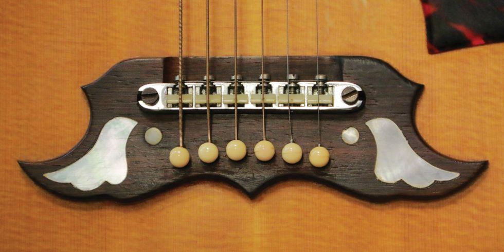 One controversial issue about Doves from the mid-’60s is the Tune-o-matic-style bridge that Gibson used for them. After they made the internal bracing heavier, Gibson received complaints about diminished tone and volume on Doves. My opinion, and that of many players I know, is that Gibson’s original bridge design of the Tune-o-matic style featuring nylon saddles that’s still intact on this ’64 was very clever. The reason: With these early models, the wood and bracing were lighter, and, with the back and sides being maple, this guitar had a really bright sound. But the Tune-o-matic bridge with the nylon saddles made the guitar easier to fine tune, and provided a more even tone with a bit of growl and edge, making for a killer rootsy rock ’n’ roll acoustic guitar sound. So, this guitar is a real badass!