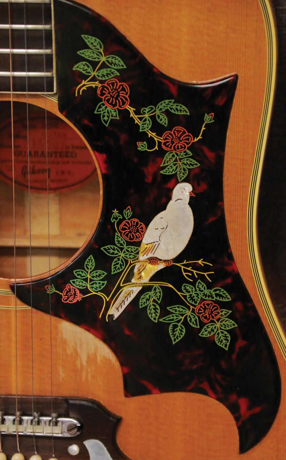The bird design on the Dove pickguard from this era was hand-cut and inlaid, and the filigrees were engraved.