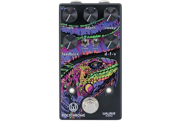 When we use the term "chameleon-like," we're normally referring to something that fits into many different surroundings. But let's consider the transformation process: Have you ever watched a chameleon change colors? It's totally psychedelic. You could take a still photo and see that within each shift, there are many subtle variations, each of which are awesome. Now, imagine if this process were a guitar tone and you'll probably have a good idea what the Walrus Audio Polychrome flanger sounds like—solid modulation tones that sit comfortably within their surroundings while shifting in trippy, immersive, fun ways.