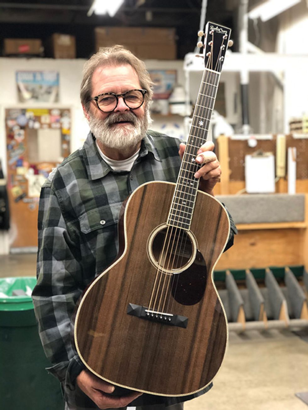 Santa Cruz Guitars’ Richard Hoover holds a spectacular redwood-topped 12-fret OOO model. Photo by Carolyn Sills