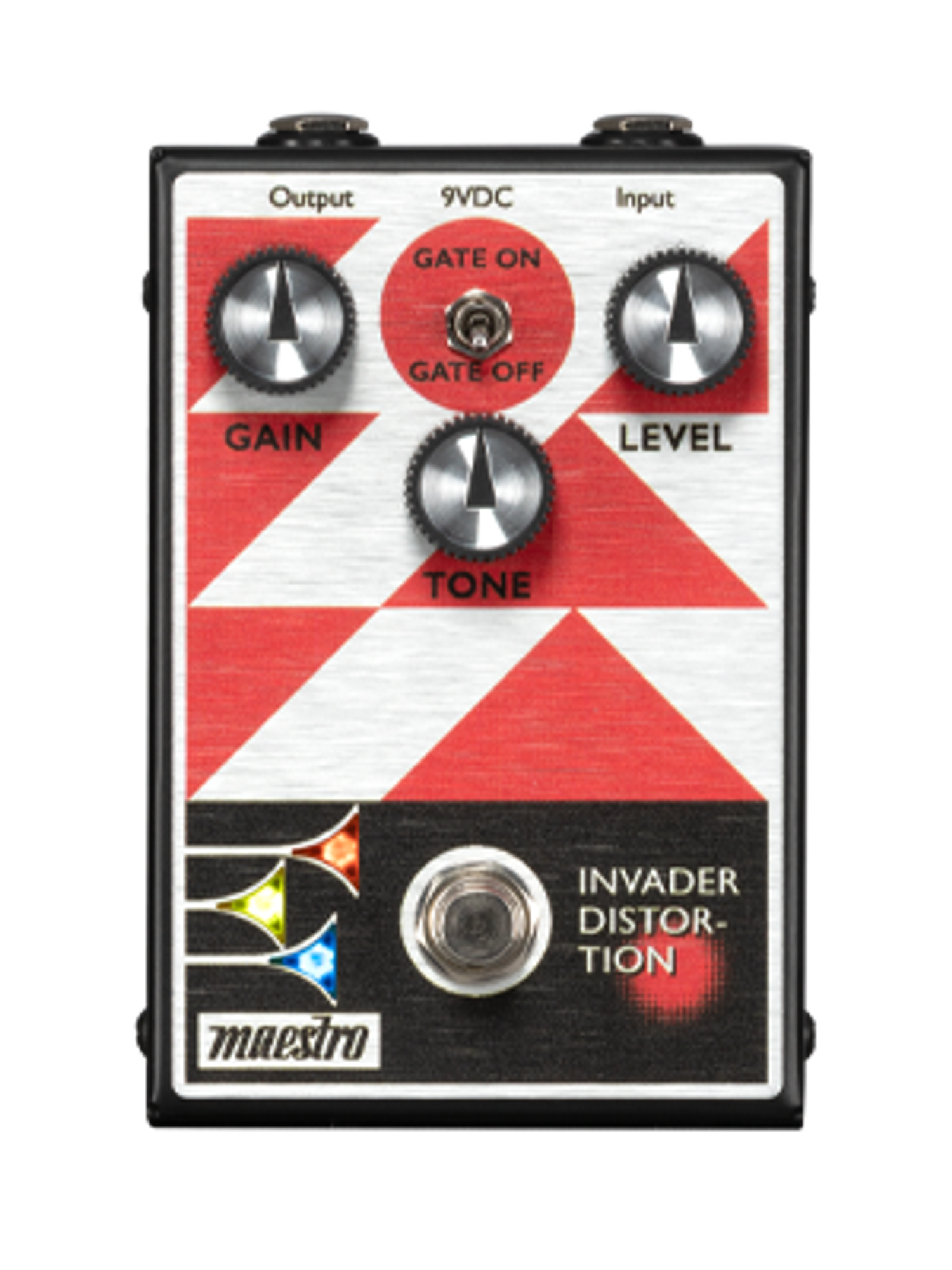 The Maestro Invader Distortion is a high-gain, all-analog modern distortion pedal with a heavy, aggressive, dominant sonic character and loads of rich harmonics. With the Maestro Invader Distortion, users can generate a wide range of distorted sounds. The 3-knob control layout gives users intuitive control over Gain (distortion amount), Tone, and output Level, with more than enough volume on tap to easily exceed unity gain when you want to. Users can also engage a built-in noise gate with the top panel toggle switch. An internal trim pot mounted on the circuit board inside the pedal allows the user to adjust the level of the noise gate's Threshold. The true bypass footswitch triggers the LED lights in the bugles in the Maestro logo when it’s on, so you’ll always know when the effect is active.