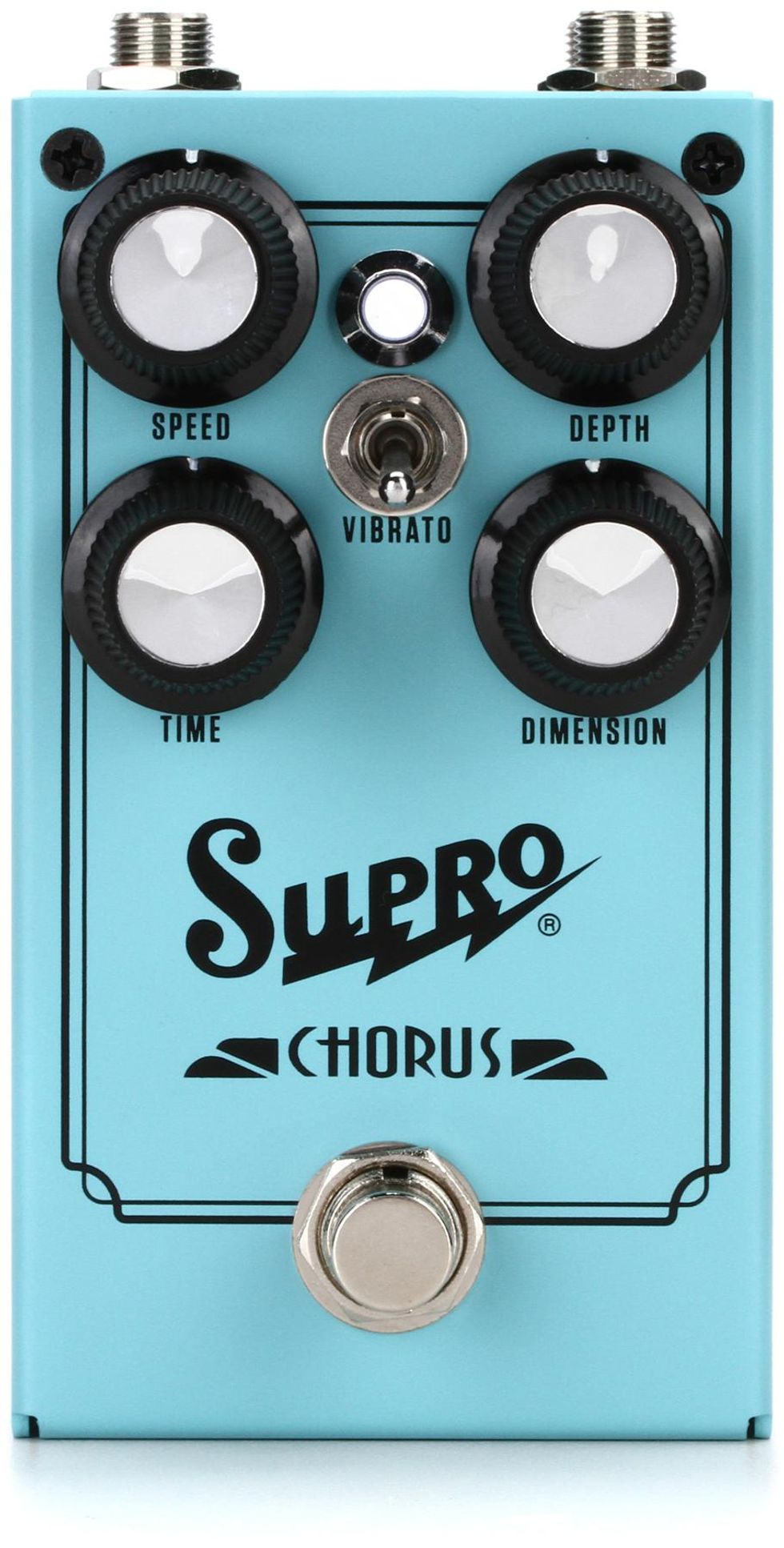 The Supro Chorus is an all-analog, full-stereo modulation stompbox that uses a pair of genuine MN3007 Bucket Brigade IC chips to deliver the thickest, most luscious Chorus effect possible in pedal form, all while maintaining exceptional headroom. In addition to Speed and Depth knobs, the Supro Chorus features a Time control that increases the delay time on one side of the stereo field while shortening the delay time on the other side. Further increasing the available drama is a Dimension control, which mixes the stereo channels into one another for a mesmerizing intermingling of the two delay lines being modulated in opposite directions. A Vibrato switch removes the clean pass-through signal, allowing for pure pitch modulation with the Dimension knob, introducing a more complex, double vibrato effect. Runs on standard 9VDC.