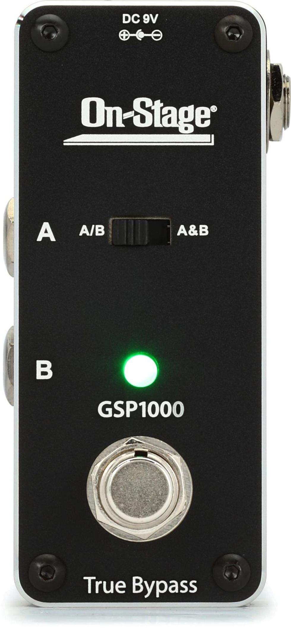 Our GSP1000 ABY Switcher gives musicians a choice of two-input/one-output or one-input/two-output configurations. This pedal excels at several applications including running one instrument to two amps in stereo, switching between two amps, plugging two instruments into one effect chain, or bypassing effects. Its true-bypass circuitry completely removes the pedal from the signal path when the pedal is turned off. The heavy-duty housing with nonslip rubber base ensures reliable performance.
