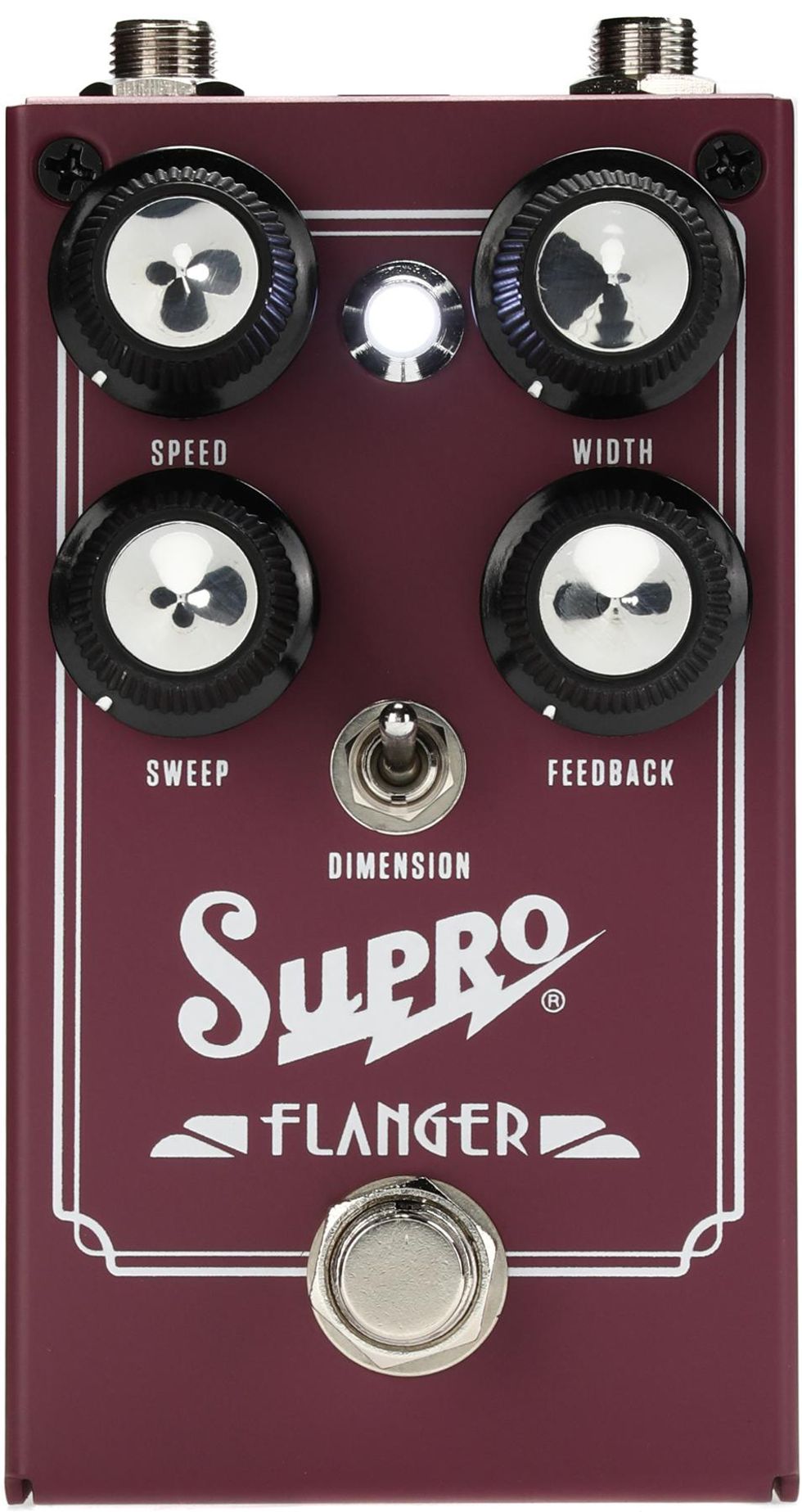 Sibling to the Supro Chorus, the Supro Flanger is an all-analog, full-stereo modulation effects pedal that uses a quartet of genuine MN3009 Bucket Brigade IC chips to deliver the absolute richest Flanger effect possible while maintaining exceptional headroom. In addition to Speed and Width knobs, the Supro Flanger features a bi-directional Feedback control and a Sweep control that increases the delay time on one side of the stereo field while shortening the delay time on the other side. Featured for the first time in a flanger pedal, the Dimension switch crossfeeds the two channels into one another, creating the entrancing double-flanger effect of two delay lines being modulated in opposite directions, even when used in mono. Runs on standard 9VDC.